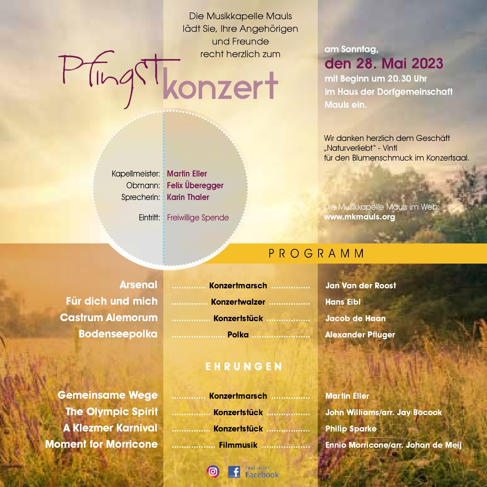 Die Musikkapelle freut sich Sie zum traditionellen Pfingstkonzert im Haus der Dorfgemeinschaft Mauls einzladen